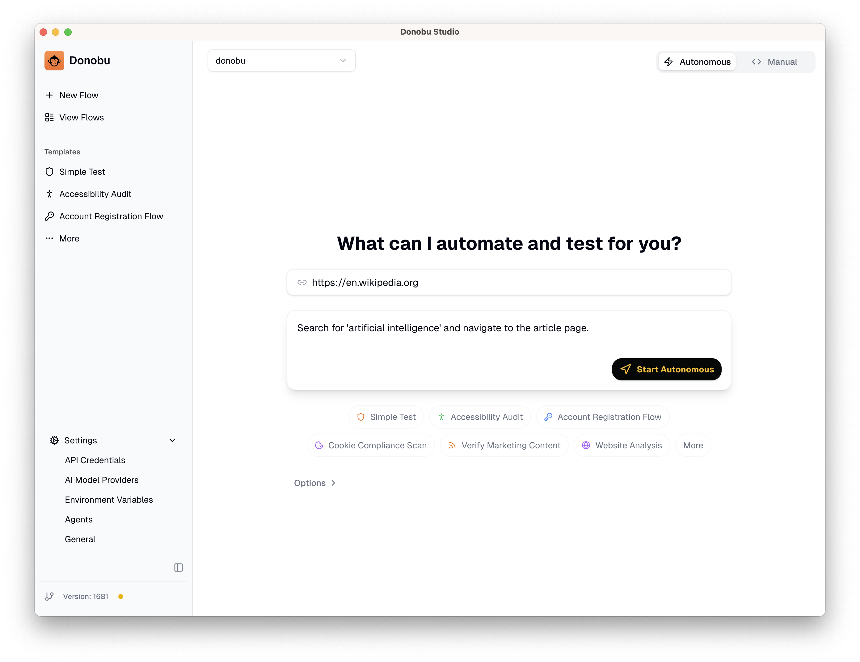 This guide walks you through creating, running, and reviewing your first testing flow in Donobu Studio.