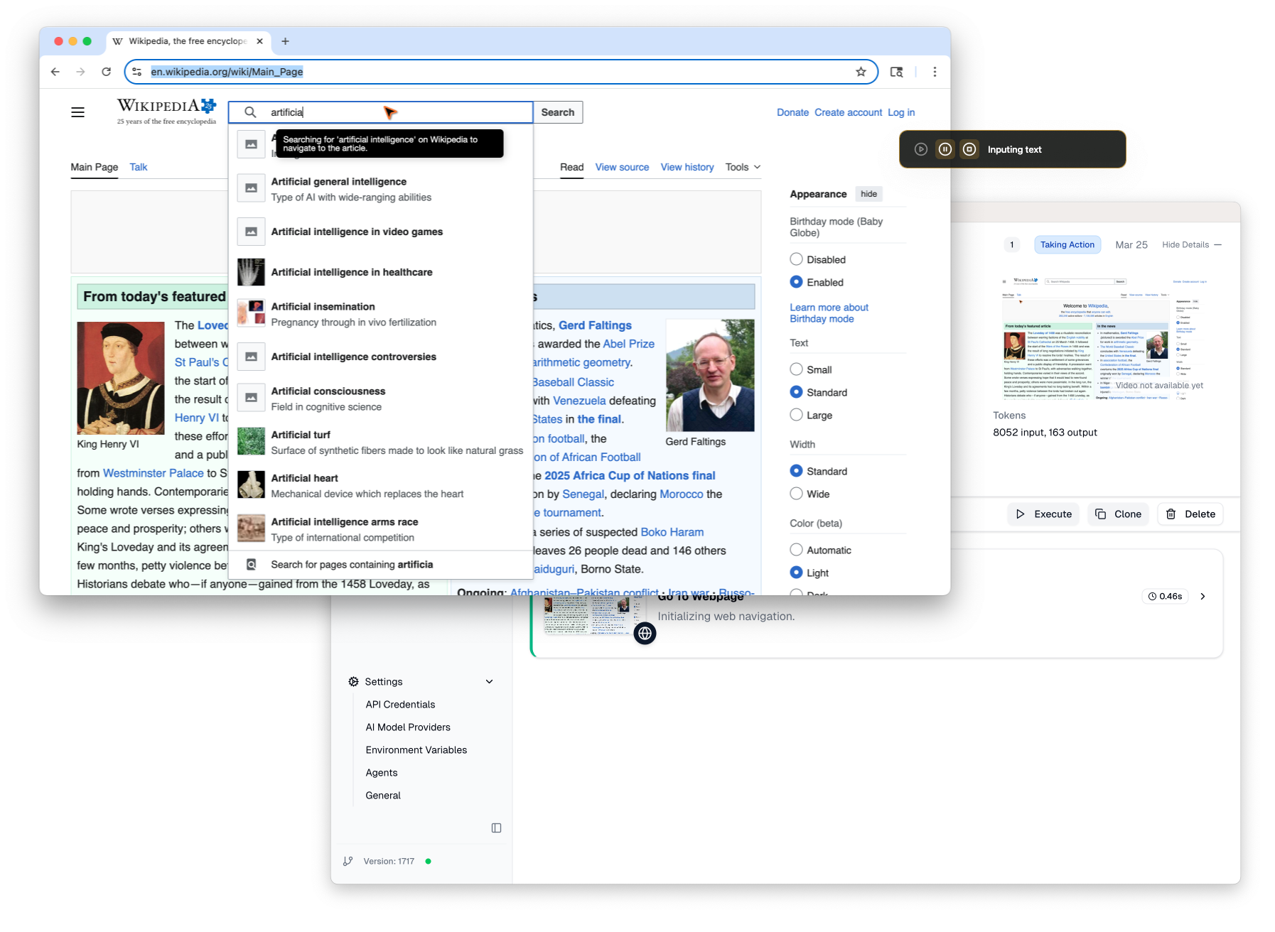 - Action description — Details about the action (e.g. "Searching for 'artificial intelligence' in the Wikipedia search bar to find the relevant article.")