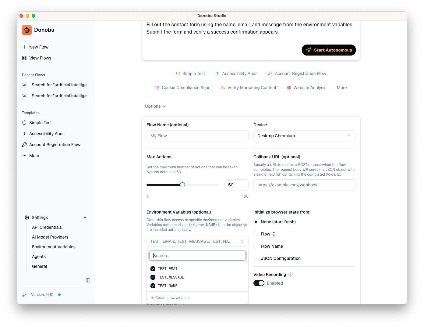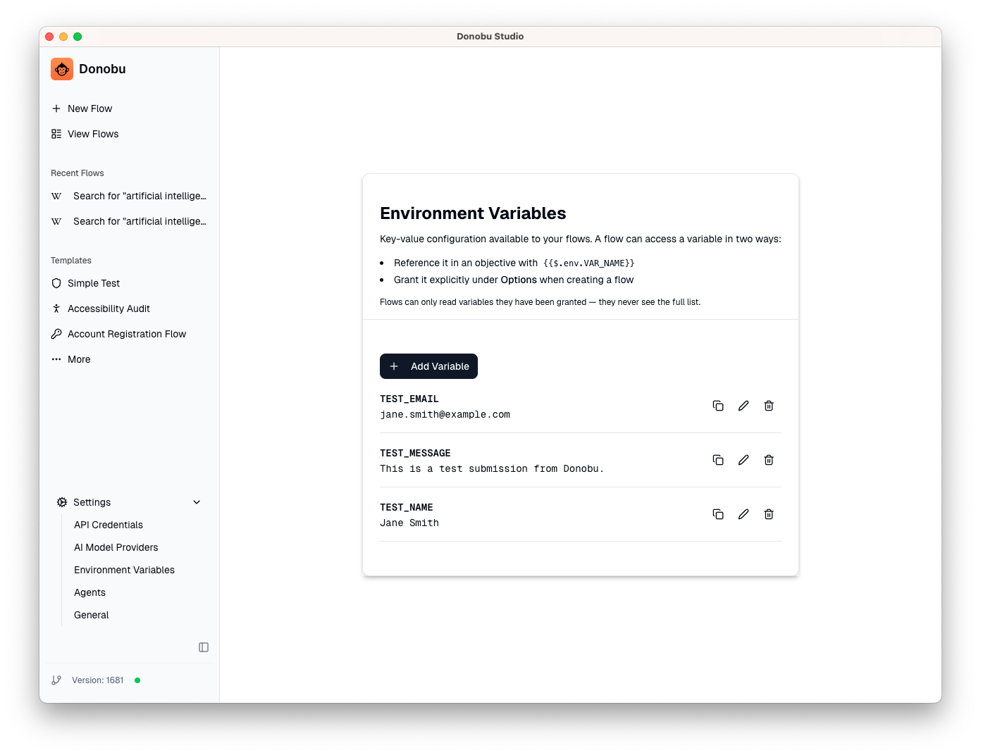 Environment variables let you store test data (names, emails, passwords) separately from your flow objectives. This keeps sensitive data out of your prompts and makes flows reusable across different environments.