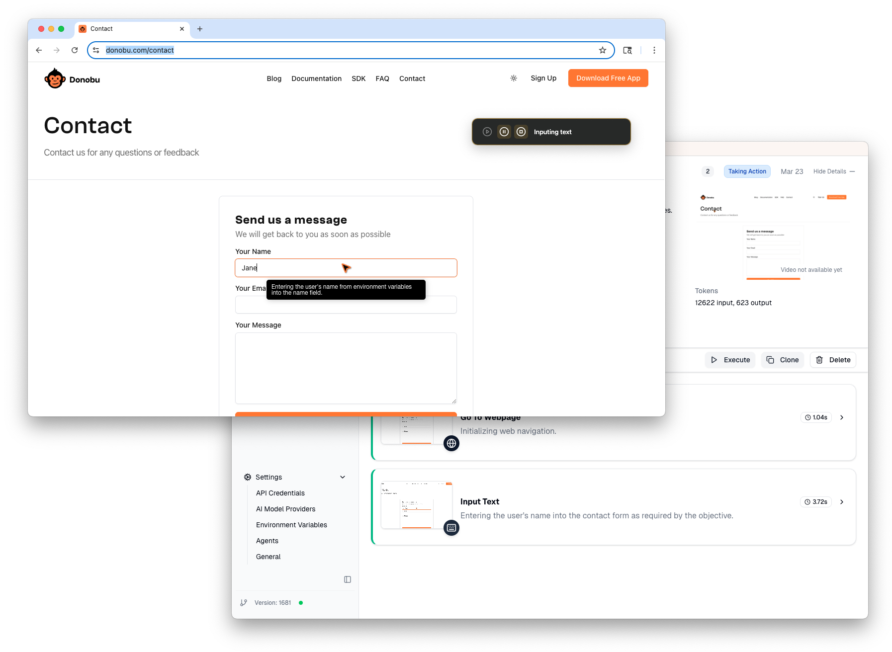 In this tutorial, you'll use Donobu Studio to automate filling out a web form. You'll learn how to use environment variables to keep test data separate from your flow objectives, and how to validate that the form submission succeeded.